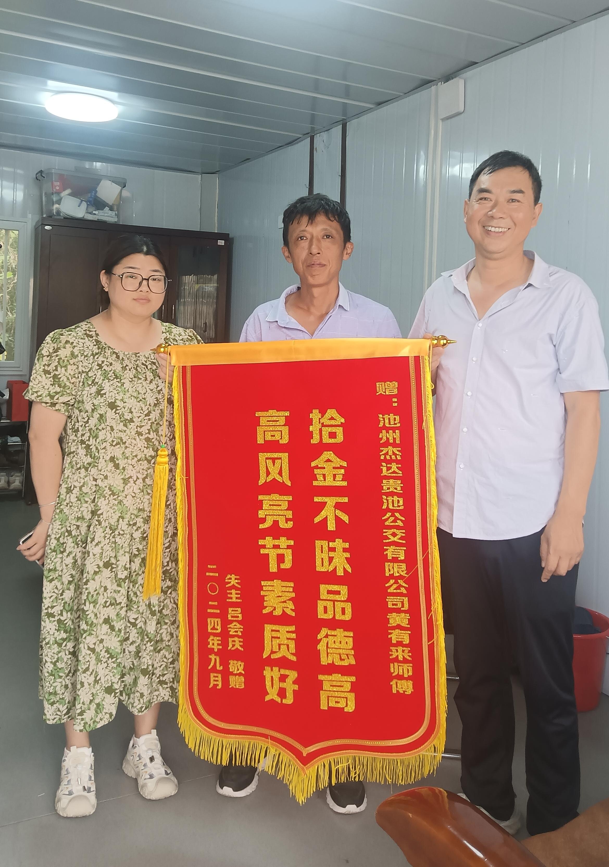 2024年9月12日下午,池州杰達(dá)貴池公交公司收到了來(lái)自上海呂會(huì)慶先生委托其朋友送來(lái)的一面錦旗。經(jīng)了解,2024年9月9日下午,公交駕駛員黃有來(lái)師傅在執(zhí)行完花廟至貴池的班次任務(wù)車輛入庫(kù)后,在打掃衛(wèi)生時(shí)發(fā)現(xiàn)后座上有一手提袋,外面散落了大量現(xiàn)金,黃有來(lái)師傅即刻將手提袋及現(xiàn)金交到調(diào)度室。失主在收到丟失物品后非常激動(dòng),送來(lái)錦旗以表謝意。黃有來(lái)作為一名普通的公交駕駛員,在崗位上展現(xiàn)出拾金不昧的精神,不僅體現(xiàn)了個(gè)人高尚的道德品質(zhì)和社會(huì)責(zé)任感,也傳遞了社會(huì)正能量。