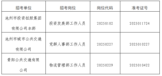 根據(jù)《池州市投資控股集團(tuán)2025年公開招聘工作人員公告》要求,由于入圍體檢的考生中有部分人員自動(dòng)放棄或不合格產(chǎn)生了人員空缺?,F(xiàn)按《公告》要求,視崗位情況進(jìn)行遞補(bǔ)?,F(xiàn)將入圍遞補(bǔ)體檢情況公告如下: