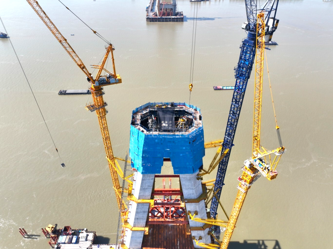 據(jù)悉,此次合龍段為4號主塔第31節(jié)段,分節(jié)高度4米,采用C60高標號混凝土澆筑。該節(jié)塔柱澆筑完成后,主塔高度已達到177.05米,相當于近60層樓高。作為支撐“跨江巨龍”屹立不倒的重中之重,主塔以其工藝精、要求高、標準嚴著稱,因而也是全橋施工的核心關鍵所在。