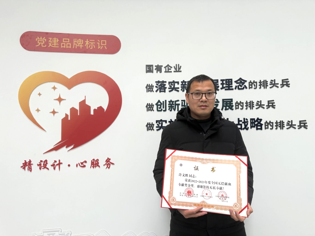 近日,集團(tuán)所屬設(shè)計(jì)總院?jiǎn)T工許文勝同志榮獲由國(guó)家衛(wèi)生健康委員會(huì)、中國(guó)紅十字會(huì)總會(huì)、中央軍委后勤保障部衛(wèi)生局頒發(fā)的“2022—2023年度全國(guó)無(wú)償獻(xiàn)血獎(jiǎng)金獎(jiǎng)”,以表彰他二十年如一日的無(wú)償奉獻(xiàn)。