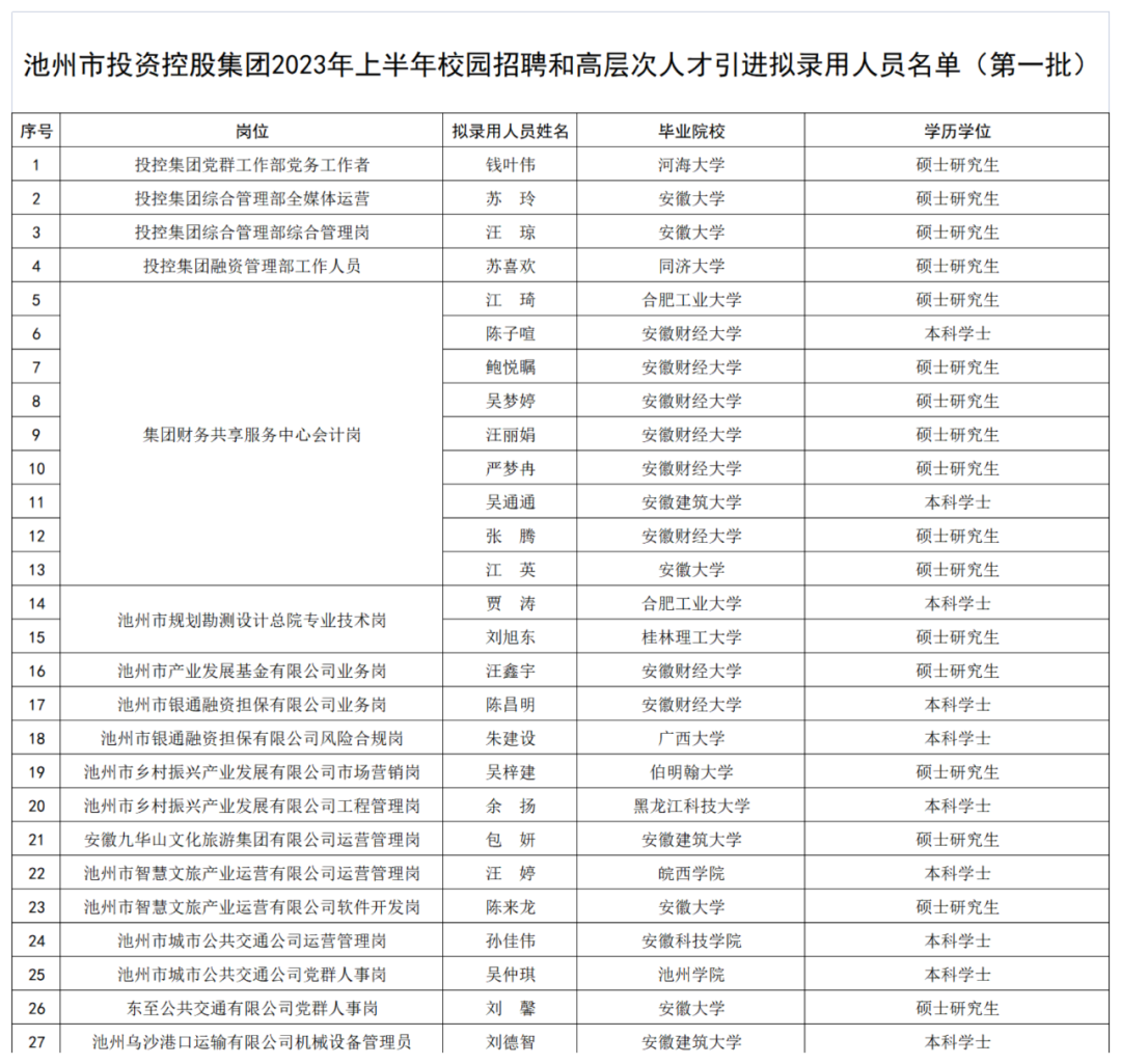 附件:池州市投資控股集團2023年上半年校園招聘和高層次人才引進擬錄用人員名單(第一批)