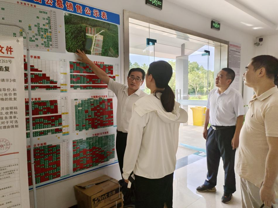 朱蕓蕓一行先后參觀了生態(tài)人文公司服務(wù)接待大廳、公墓銷售公示欄,聽取了生態(tài)人文公司目前安全生產(chǎn)、服務(wù)經(jīng)營(yíng)等方面工作匯報(bào),并實(shí)地察看了池州生態(tài)人文紀(jì)念園項(xiàng)目施工現(xiàn)場(chǎng),深入了解了園區(qū)規(guī)劃、公益性墓區(qū)、骨灰堂等工程建設(shè)相關(guān)情況。