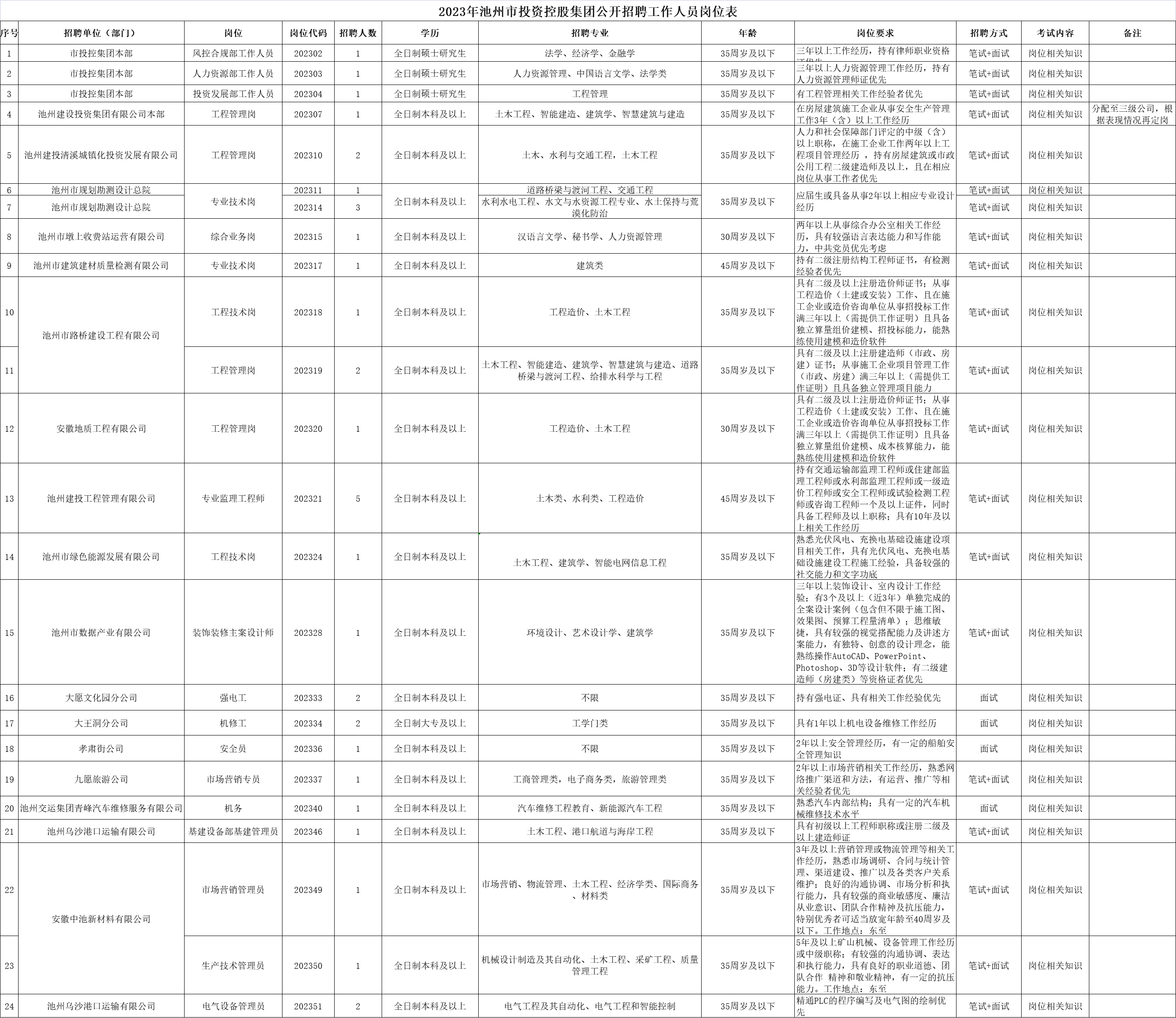 2023年池州市投資控股集團(tuán)公開(kāi)招聘報(bào)名工作即將結(jié)束,截止2023年9月15日20:00,共有24個(gè)職位35個(gè)計(jì)劃招聘數(shù)暫時(shí)無(wú)人報(bào)考或達(dá)不到開(kāi)考比例,如2023年9月17日24:00報(bào)名時(shí)間截止前仍達(dá)不到開(kāi)考比例,將核減或取消該崗位招聘計(jì)劃。有意向報(bào)名人員請(qǐng)登陸池州人事考試網(wǎng)(http://rskszx.czsrsj.chizhou.gov.cn)報(bào)名,審核未通過(guò)人員可改報(bào)其他符合條件崗位。