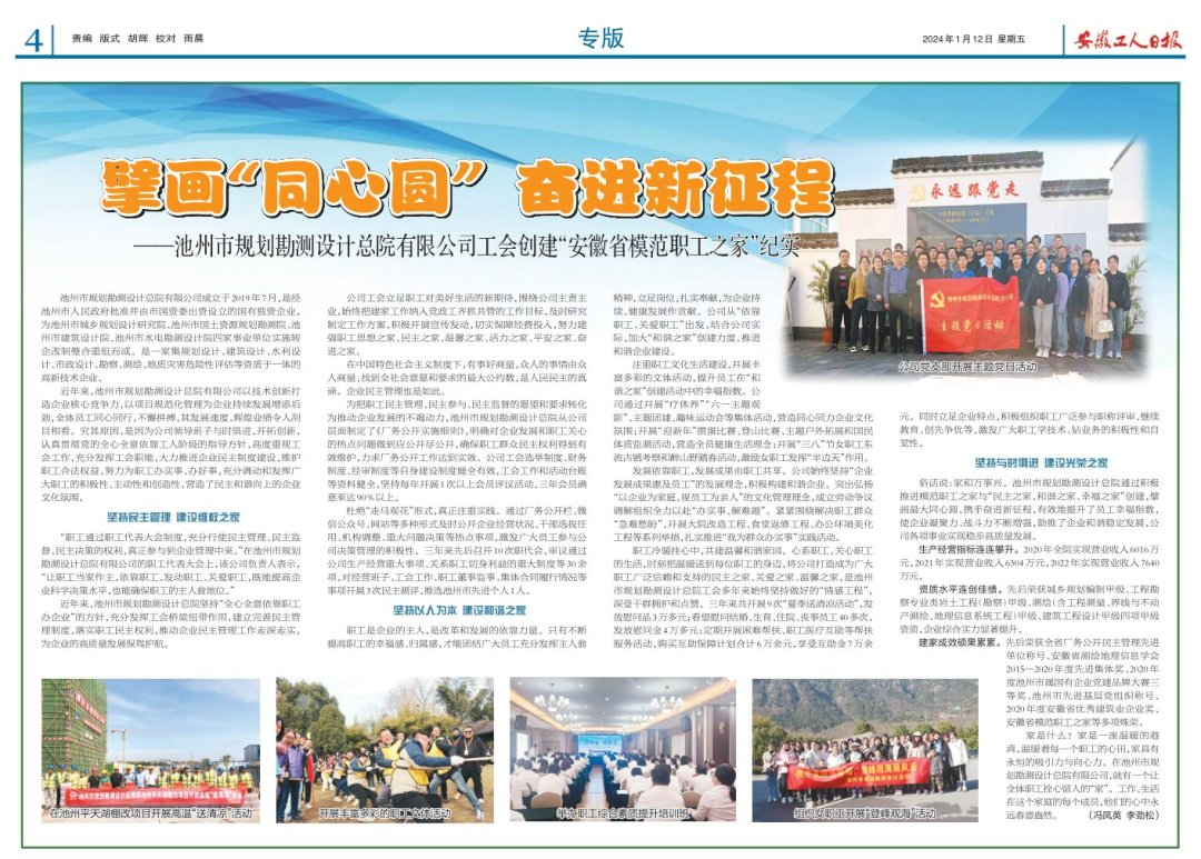 近日,安徽省總工會發(fā)布《關(guān)于命名安徽省模范職工之家、安徽省模范職工小家和安徽省優(yōu)秀工會工作者的決定》,集團(tuán)下屬設(shè)計總院榜上有名,榮獲“安徽省模范職工之家”榮譽(yù)稱號。今日,《安徽工人日報》對設(shè)計總院職工之家創(chuàng)建進(jìn)行了報道以下為報道全文
