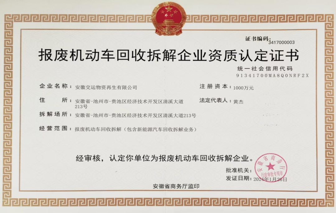 近日,集團所屬安徽交運物資再生有限公司順利通過安徽省商務(wù)廳批準,成功獲得報廢機動車回收拆解企業(yè)資質(zhì)認定證書 。