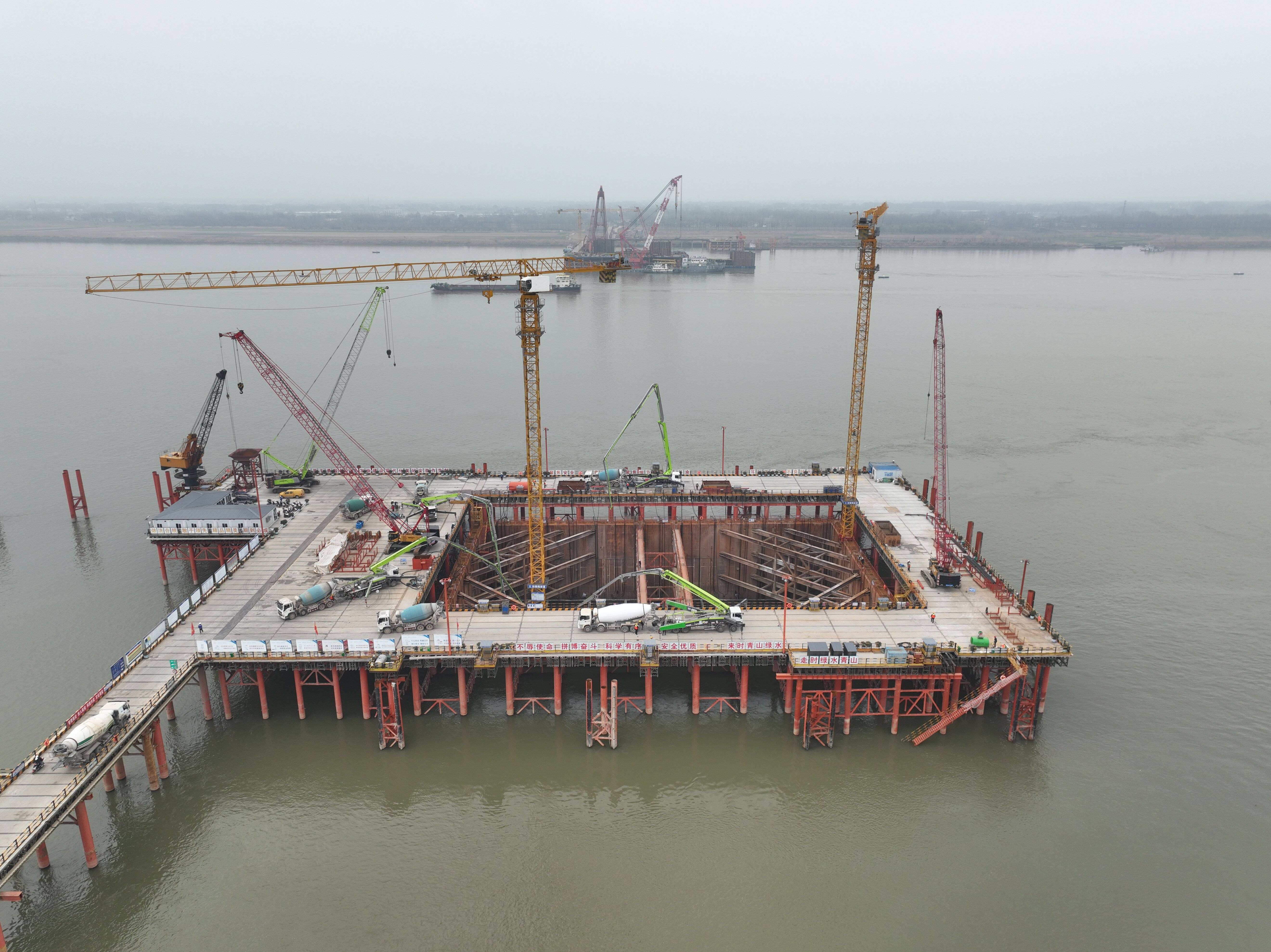 據(jù)悉,池州長江公鐵大橋4號(hào)主墩采用雙壁鋼套箱圍堰的施工工藝,在圍堰內(nèi)展開承臺(tái)施工,承臺(tái)的平面尺寸為75.6m×47.6m,厚度為7.0m,共需使用鋼筋4100余噸,需澆筑混凝土約25600立方米,為確保承臺(tái)施工質(zhì)量,項(xiàng)目部在施工過程中采用大體積混凝土施工工藝分兩次澆筑混凝土。本次澆筑為承臺(tái)首次澆筑混凝土,澆筑高度為3.5米,采用C45混凝土不間斷的進(jìn)行澆筑施工。
