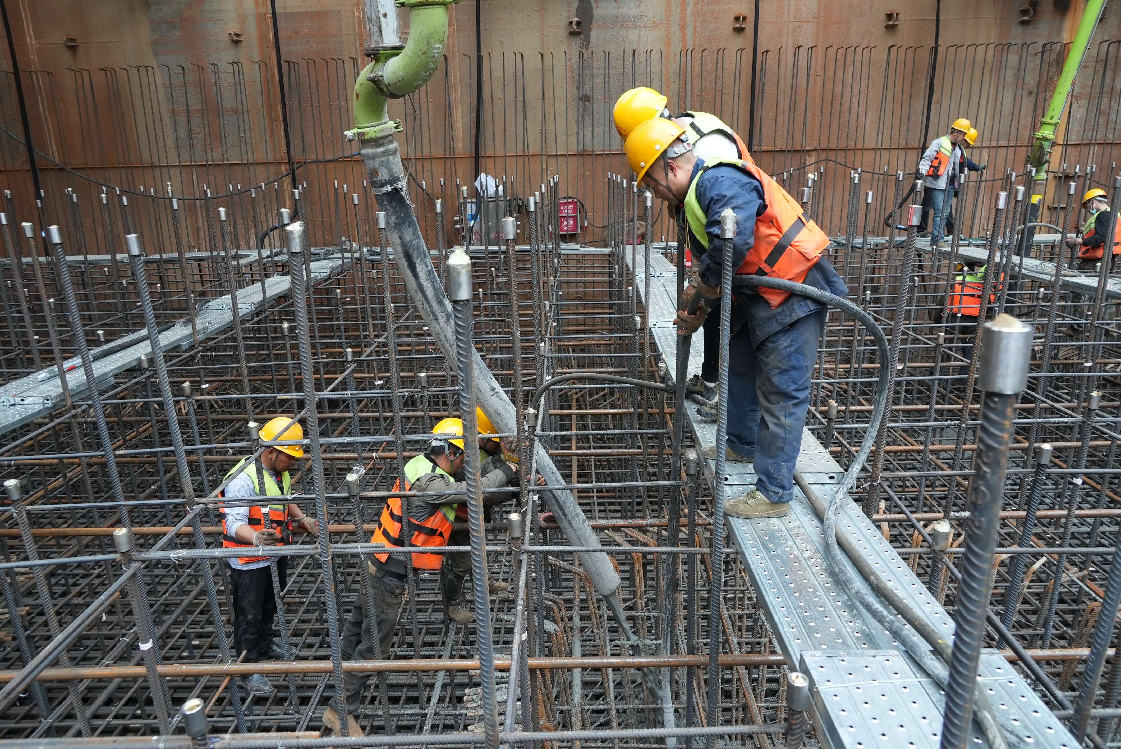據(jù)施工單位池州長江公鐵大橋4號(hào)墩現(xiàn)場負(fù)責(zé)人介紹,此次澆筑的混凝土體量龐大,澆筑施工過程可能出現(xiàn)混凝土溫度急劇升高等技術(shù)難題,為此,各參建單位集思廣益,超前謀劃,“多管”齊下。一是措施詳細(xì)化,在施工前會(huì)同武漢理工大學(xué)對(duì)承臺(tái)溫控施工方案進(jìn)行研究編制;二是布局提前化,在承臺(tái)施工過程中預(yù)埋冷卻水管,待混凝土澆注后,即可通過水管內(nèi)循環(huán)流動(dòng)的冷卻水對(duì)混凝土進(jìn)行冷卻降溫;三是過程信息化,在承臺(tái)預(yù)先設(shè)置了溫控點(diǎn),安裝測(cè)溫元件,在承臺(tái)冷卻階段,各溫控點(diǎn)將實(shí)時(shí)監(jiān)測(cè)混凝土溫度,并將相關(guān)數(shù)據(jù)反饋至項(xiàng)目部信息化處理中心,項(xiàng)目部可以精準(zhǔn)把控承臺(tái)整體溫度情況,隨時(shí)調(diào)整冷卻水管中水流速度,避免出現(xiàn)大體積混凝土因散熱不均產(chǎn)生質(zhì)量問題。