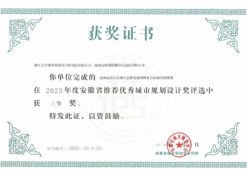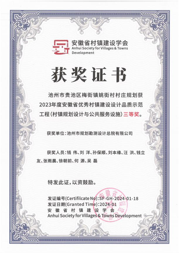 近日,安徽省村鎮(zhèn)建設(shè)學(xué)會和安徽省城市規(guī)劃學(xué)會分別揭曉了2023年度安徽省優(yōu)秀村鎮(zhèn)建設(shè)設(shè)計(jì)品質(zhì)示范工程和2023年度安徽省推薦優(yōu)秀城市規(guī)劃設(shè)計(jì)獎的獲獎名單。由集團(tuán)所屬設(shè)計(jì)總院公司編制完成的《池州市貴池區(qū)梅街鎮(zhèn)姚街村村莊規(guī)劃》和《池州市濱江區(qū)域生態(tài)修復(fù)規(guī)劃暨重點(diǎn)區(qū)域詳細(xì)規(guī)劃》兩個項(xiàng)目分別榮獲2023年度安徽省優(yōu)秀村鎮(zhèn)建設(shè)設(shè)計(jì)品質(zhì)示范工程(村鎮(zhèn)規(guī)劃設(shè)計(jì)與公共服務(wù)設(shè)施)三等獎和2023年度安徽省推薦優(yōu)秀城市規(guī)劃設(shè)計(jì)獎三等獎。
