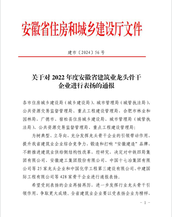 4月10日,安徽省住房和城鄉(xiāng)建設(shè)廳發(fā)布了《關(guān)于對(duì)2022年度安徽省建筑業(yè)龍頭骨干企業(yè)進(jìn)行表揚(yáng)的通報(bào)》,集團(tuán)所屬池州市規(guī)劃勘測(cè)設(shè)計(jì)總院有限公司榮登榜單。