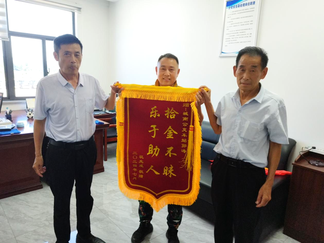 6月25日下午,池州市城市公共交通有限公司收到了乘客陸先生從河北郵寄來的一面錦旗。6月23日早上7:40分,城市公交客服熱線接到了乘客陸先生打來的電話,陸先生表示自己的手機和身份證丟了,半小時前乘坐過19路公交車。調(diào)度員在了解情況后立刻通過調(diào)度系統(tǒng)鎖定車輛并聯(lián)系公交師傅。楊克成師傅在靠站后找到了一個手機和一個身份證,立刻拍照發(fā)給調(diào)度中心進行了核實,并對物品進行了保管。上午10:30分,陸先生在1908車楊克成師傅手上接過了自己遺失的手機和身份證,激動萬分,表示手機里的文件非常重要,能夠這么快完好無損的找回來自己很開心,非常感謝楊師傅。楊師傅表示“拾金不昧,物歸原主”是自己作為駕駛員應(yīng)該做的,哪怕是一根針一根線我們找到了都會保管好還給乘客。